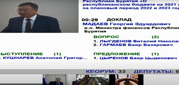В Хурале Бурятии утвердили первые в этом году поправки в закон о республиканском бюджете. На сессии с докладом по проекту закона Республики Бурятия «О внесении изменений в закон Республики Бурятия «О республиканском бюджете на 2021 год и на плановый период 2022 и 2023 годов» выступил министр финансов Георгий Мадаев.