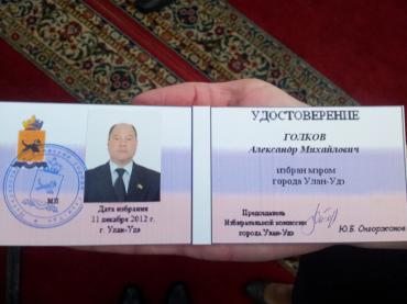Удостоверение мэра Улан-Удэ получил Александр Голков сегодня, 13 декабря. Напомним, Голков был избран мэром города 11 декабря. В ходе сессии Городского Совета депутатов за него проголосовали 24 из 26 присутствующих депутатов. Второй кандидат ан этот пост, депутат Горсовета, председатель комитета Городского хозяйства Алексей Шуляк, набрал лишь два голоса.