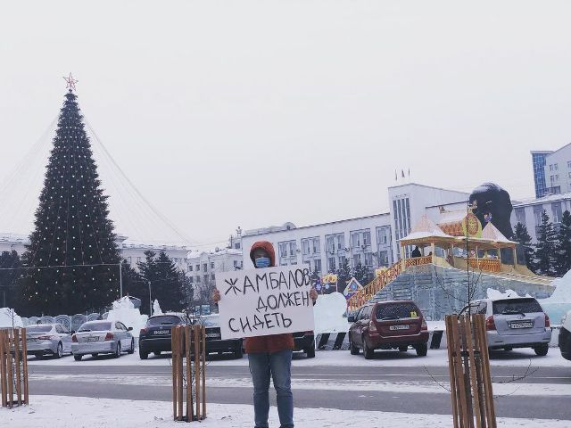Житель Бурятии устроил на площади Советов в Улан-Удэ одиночный пикет по делу бывшего вице-спикера Народного Хурала Баира Жамбалова, который обвиняется в смертельном ДТП. Молодой человек стоял с плакатом с надписью «Жамбалов должен сидеть». Фотографией поделились в соцсетях сегодня, 28 января, сообщает Восток-Телеинформ.