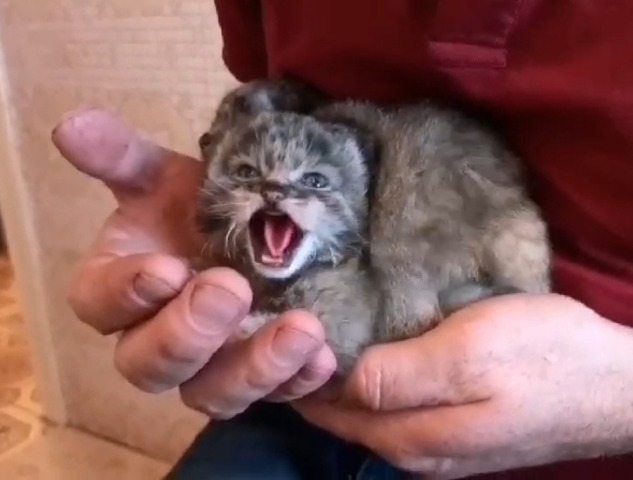 Котята крупные, по виду манул: пушистая шерсть, короткий хвостик, круглый зрачок, уши посажены низко и будто обрезаны, мордочка плоская.