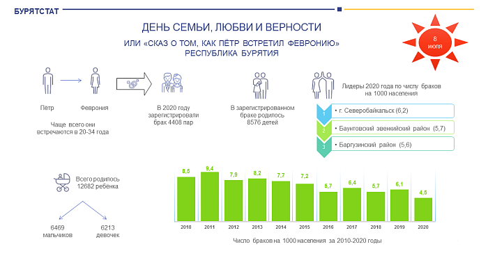 По итогам 2020 года наиболее часто женились жители Северобайкальск (6,2 браков на 1000 населения, по республике показатель составляет 4,5), на втором и третьем местах - Баунтовский (5,7) и Баргузинский (5,6) районы. Жители Улан-Удэ показали скромный результат - 4,4 брака на 1000 населения.