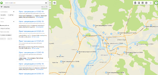 В Бурятии пункты вакцинации от COVID-19 появились в популярном сервисе «2ГИС». Данные о пунктах вакцинации собраны специалистами Центра управления регионом (ЦУР), совместно с региональным Минздравом они были верифицированы и переданы картографам одного из самых популярных приложений Бурятии.